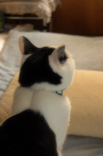 捨てられてまもなく、ルンボ家ベランダから景色を眺めている哀愁漂う後ろ姿をルンボに目撃される。