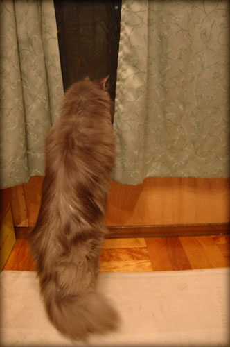 捨てられてまもなく、ルンボ家ベランダから景色を眺めている哀愁漂う後ろ姿をルンボに目撃される。